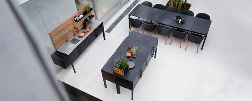 Die Drop-Serie, entworfen vom Cane-line Design, besteht aus einer Kollektion, die ein Outdoor-Küchenkonzept und elegante Tische umfasst. Der Rahmen der Serie besteht aus speziell designten Profilen, die eine robuste Konstruktion und ein elegantes Finish miteinander verbindet. Mit Drop Kitchen verlegt Cane-line einen weiteren Raum aus dem Haus in den Garten und verlängert somit die Zeit auf der Terrasse.
