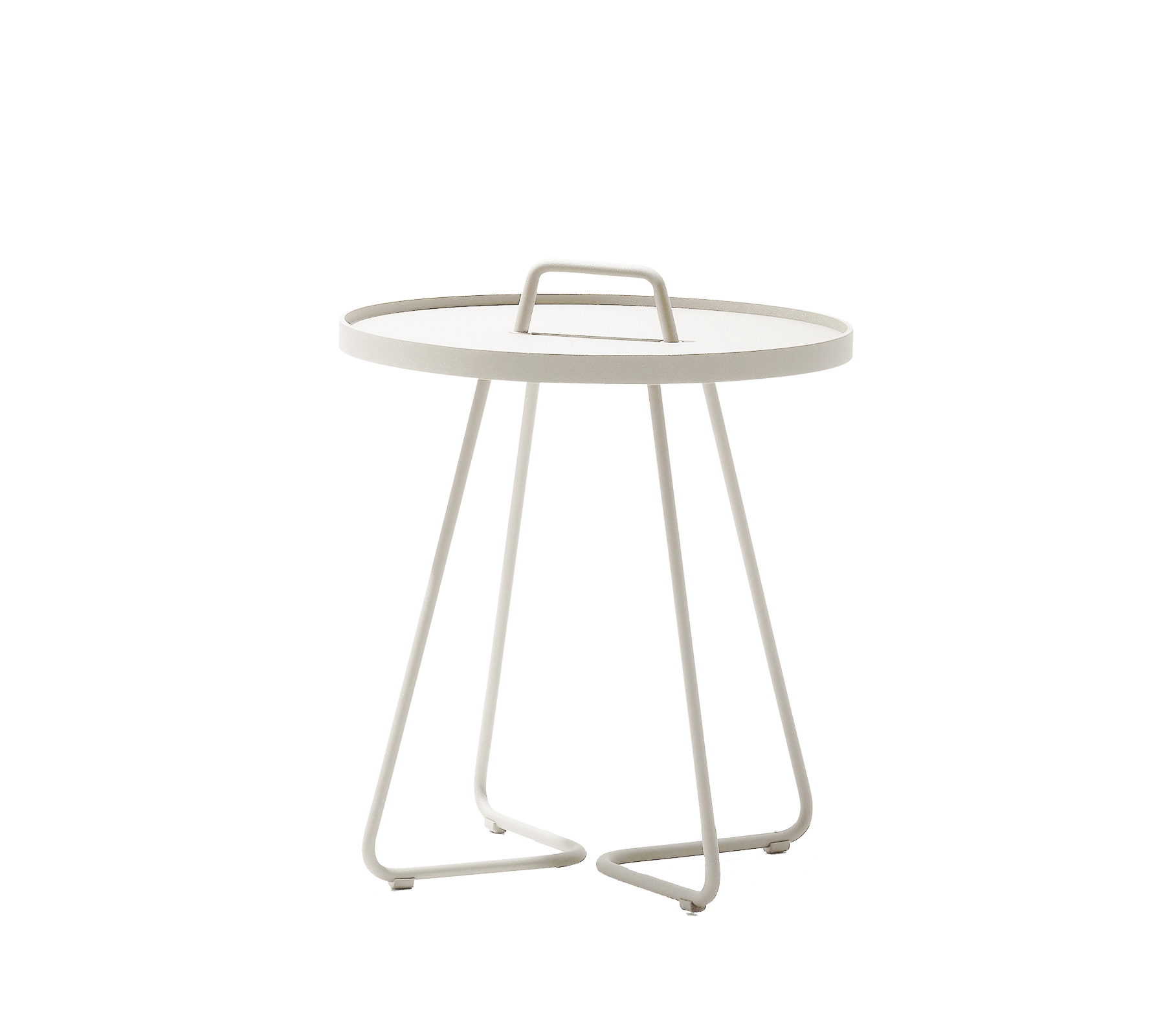 On-the-move ist ein leichter, schicker Beistelltisch – er ist elegant und praktisch mit seinem griffigen Henkel und dem abnehmbaren Tablett, das im Handumdrehen in ein nützliches Tablett verwandelt werden kann. Da er aus Aluminium besteht, ist er der ideale Begleiter im Freien wie im Haus.