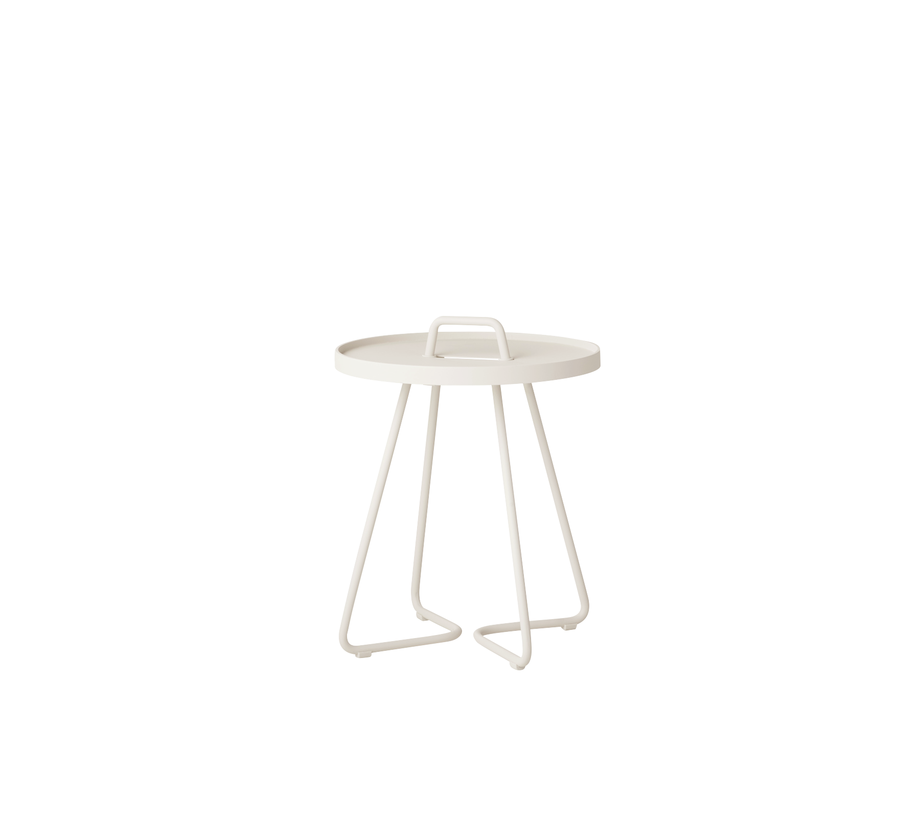 On-the-move ist ein leichter, schicker Beistelltisch – er ist elegant und praktisch mit seinem griffigen Henkel und dem abnehmbaren Tablett, das im Handumdrehen in ein nützliches Tablett verwandelt werden kann. Da er aus Aluminium besteht, ist er der ideale Begleiter im Freien wie im Haus.