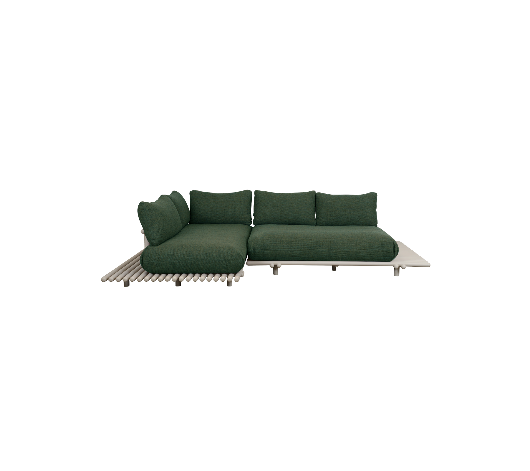 Die Ecksofa-Kombination besteht aus zwei Sticks Platform-Modulen, die eine einladende und entspannte Atmosphäre schaffen. Ergänzen Sie die Module mit einer Tischplatte, um eine elegante Fläche für Getränke, Snacks oder Dekorationen zu schaffen – eine stilvolle Möglichkeit, Materialien zu mixen und eine persönliche, elegante Outdoor-Einrichtung zu gestalten.