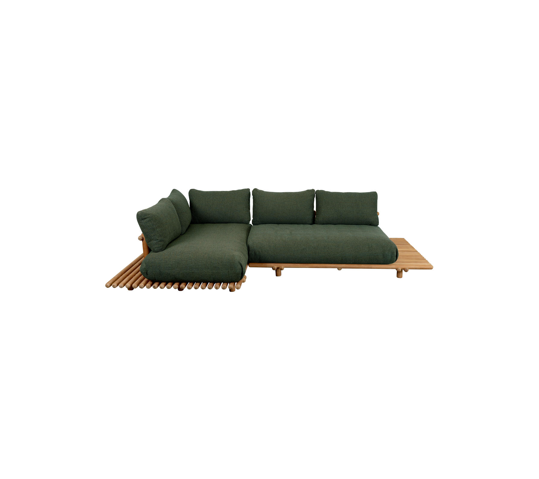 Das Sticks Platform Ecksofa, entworfen von Cane-line Design, vereint entspannte Komfortmomente mit einem anspruchsvollen Design. Es ist ideal für ruhige Entspannung oder gemütliche Treffen mit Familie und Freunden. Das robuste Gestell ist in zertifiziertem Teakholz erhältlich, das mit der Zeit eine attraktive silbergraue Patina entwickelt. Um die ursprüngliche goldbraune Farbe zu erhalten, empfehlen wir die Verwendung unserer Teak Care-Produkte. Alternativ steht das Gestell aus pulverbeschichtetem Aluminium zur Verfügung, das äußerst langlebig und pflegeleicht ist.